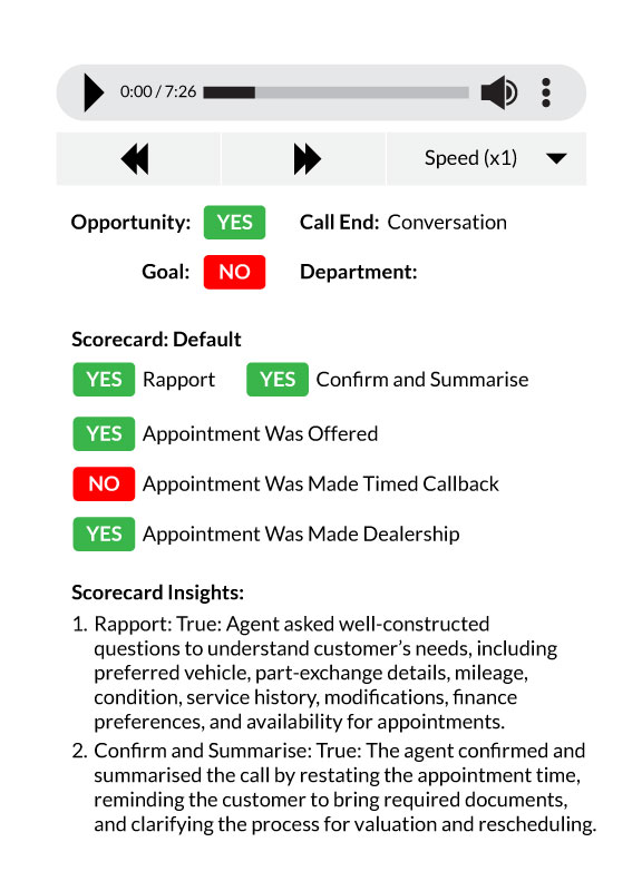 Each scorecard contains a recording of the call, allowing your team to listen to the areas they did well and where they didn’t achieve key performance metrics. Colour coded markers offer an at-a-glance summary of how the call was scored, along with descriptive insights of how the agent performed against your chosen key performance markers.